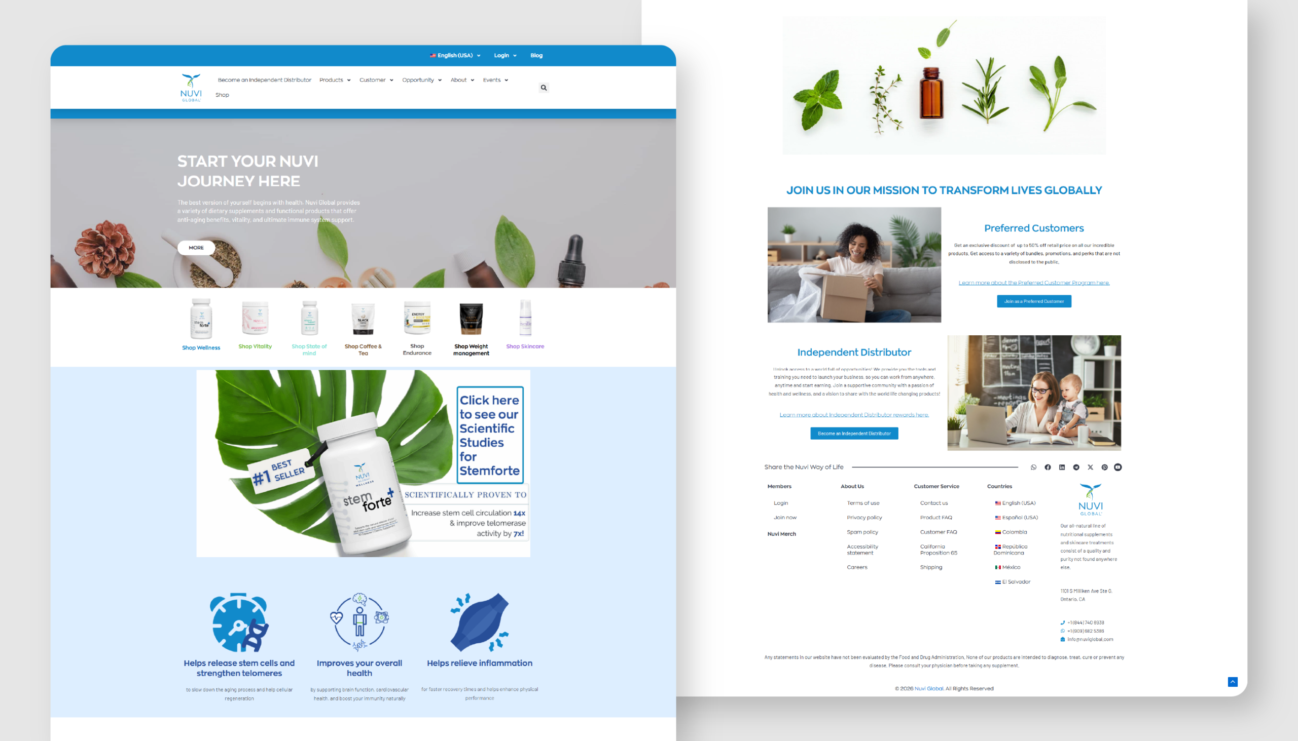 En Nuvi Global desarrollé un proyecto web enfocado en comunicar de forma clara su propuesta dentro del mercado de suplementos y network marketing. El sitio se estructuró para presentar sus productos de manera limpia, generar confianza en nuevos usuarios y guiar la navegación hacia su tienda externa exclusiva para miembros registrados, optimizando la experiencia del usuario en cada paso. A nivel visual el diseño refuerza la credibilidad de la marca y facilita la conversión dentro de su ecosistema digital.